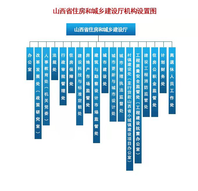 分管处室:人事教育处(机关党委)、建筑与勘察设计市场监管处、工程质量安全监管处、城市建设处、建设工程消防监管处、建设科技与标准定额处、计划财务处、离退休人员工作处。