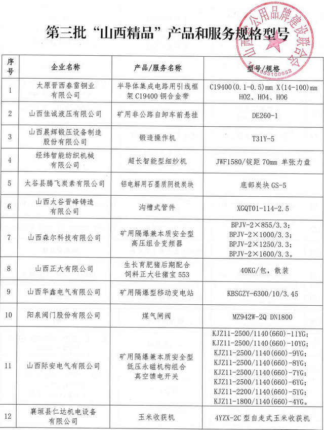 本报讯(记者孟婷)6月27日,记者从山西省公用品牌建设联合会获悉,经过企业自愿申报、形式审查、标准先进性评价、现场审核、认证/采信、征求意见等严格的评定程序,太原晋西春雷铜业有限公司、经纬智能纺织机械有限公司、山西佳诚液压有限公司、山西正大有限公司、山西丽华大酒店等41家企业的41个产品和服务获评成为2024年度“山西精品”。截至目前,“山西精品”已评选出117家企业的120个产品和服务。