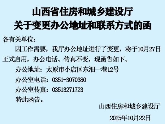【行业动态】山西省住房和城乡建设厅关于变更办公地址和联系方式的函