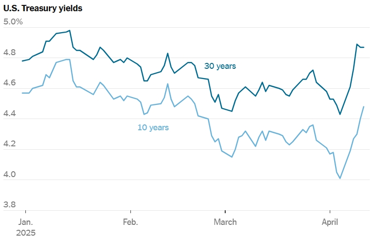 美国《纽约时报》也指出,美国国债以美国政府信用作支撑,长期以来都被视为全球最安全、最稳定的市场之一。然而,美债市场的表现相当异常。因为通常在金融市场不稳定时期,投资者会涌入美债避险,从而推高债券价格,拉低收益率,而近日的实际情况却恰恰相反。