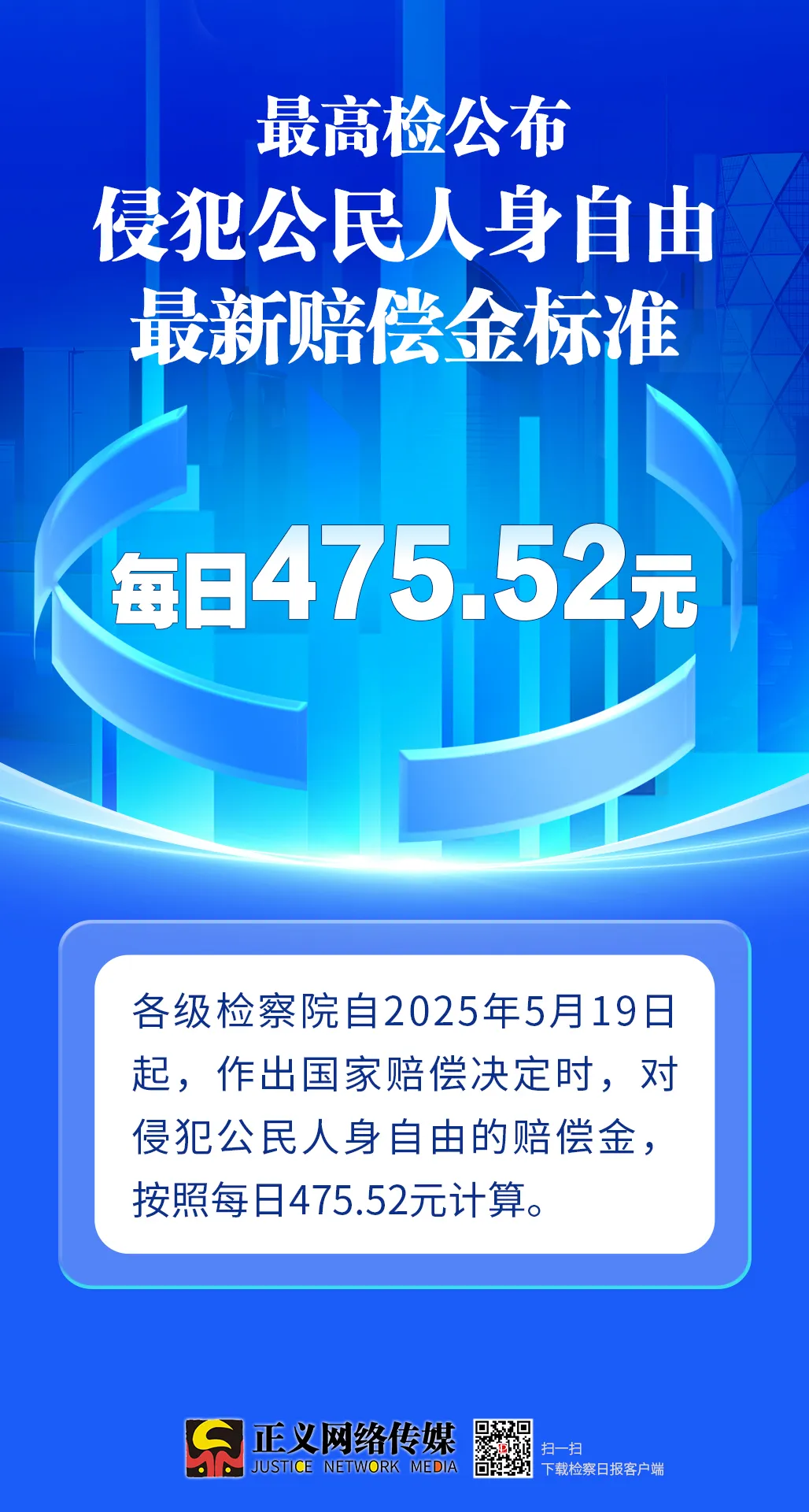 最高人民检察院日前下发通知,要求各级检察院办理自身作为赔偿义务机关的侵犯人身自由国家赔偿案件时,执行新的日赔偿标准475.52元。