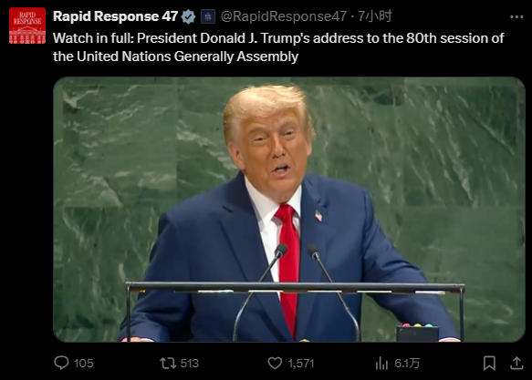 23日,特朗普在联合国大会发表讲话 推文截图